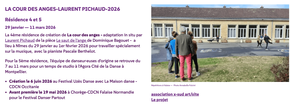 Le parcours pour chaque élève, avec Laurent Pichaud ou les interprètes Annabelle Pulcini et Catherine Legrand est constitué d’ateliers de pratique artistique et/ou chorégraphique ; d’ateliers de médiation sur la danse et les métiers du spectacle ; du spectacle La cour des anges de Laurent Pichaud programmé le 19 mai 2026 à Falaise, lors du festival Danser partout ; d’une restitution des ateliers.