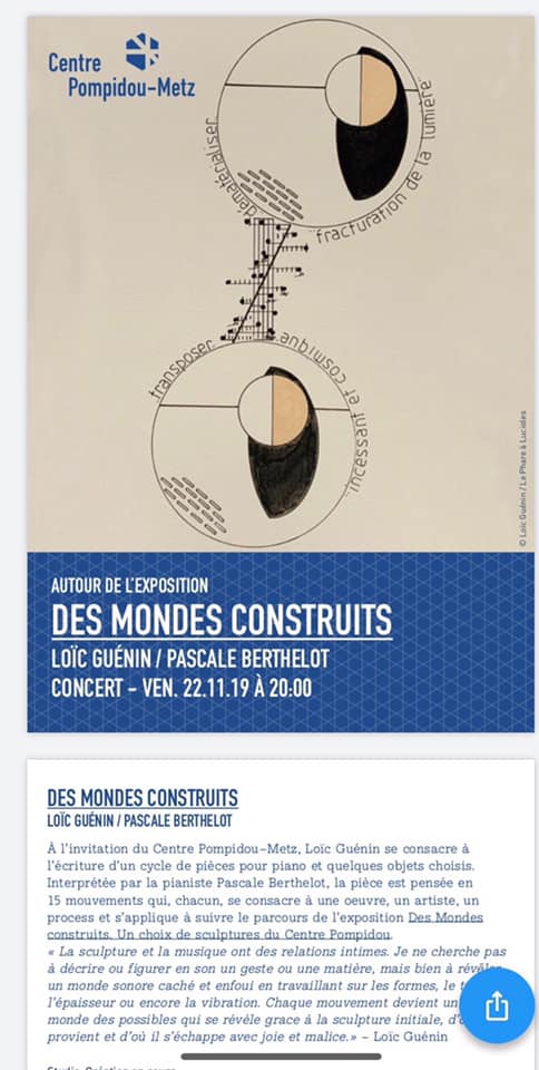 Quoi de plus surréaliste pourrions-nous penser que de composer une œuvre dont nous n’entendrions jamais la positive version … Mais alors que je jouais de plus en plus lentement l’ « adagio sostenuto », que je travaillais sur l’étirement des tempi, le respect des proportions rythmiques et sonores j’entendis comme un envers de la pièce percer, une myriade d’harmonies, de fréquences, de bruits s’épanouïr, se déployer, errer, se rencontrer, créant de nouveaux espaces d’où de nouveaux spectres sonores se révélaient .